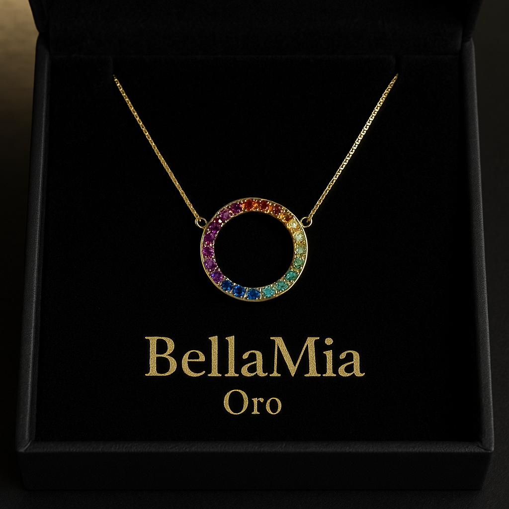Cadena en oro 18k amarillo con dije redondo oro 18k amarillo con engaste en uñas de piedras preciosas y semipreciosas corte brillante (22 piedras)
