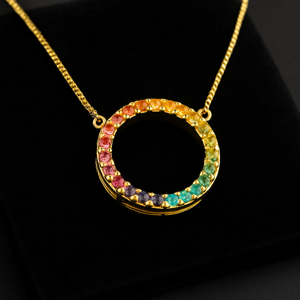 Cadena en oro 18k amarillo con dije redondo oro 18k amarillo con engaste en uñas de piedras preciosas y semipreciosas corte brillante (22 piedras)